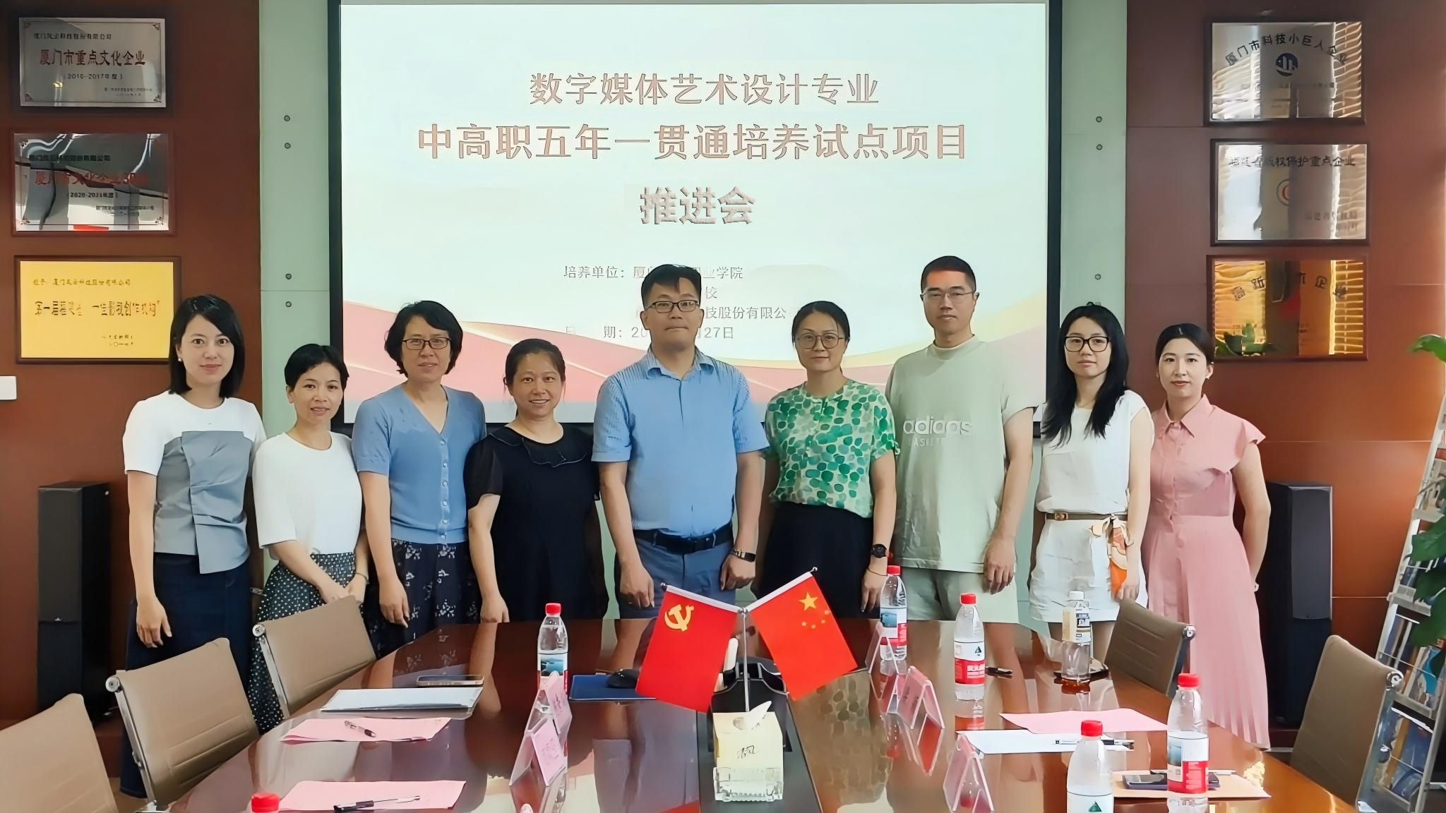 数媒专业教师代表刘萍、梁颖、孙航和厦门风云科技有限公司董事长黄顺坚、总经理卢志民,厦门信息学校招生就业科科长江榕霞及信息部教师代表郑紫英、黄梅香、陈明雅,三方齐聚厦门风云科技有限公司,围绕构建“校—校—企”深度融合协作机制,就创新协同育人模式、深化产教融合等核心领域明确多项具体工作举措,同时确定推进的时间表与路线图。三方还就联合开发中高职贯通课程及配套教材、组织师生参与竞赛、推进双师培养及引入行业评价标准等具体举措达成合作意向。