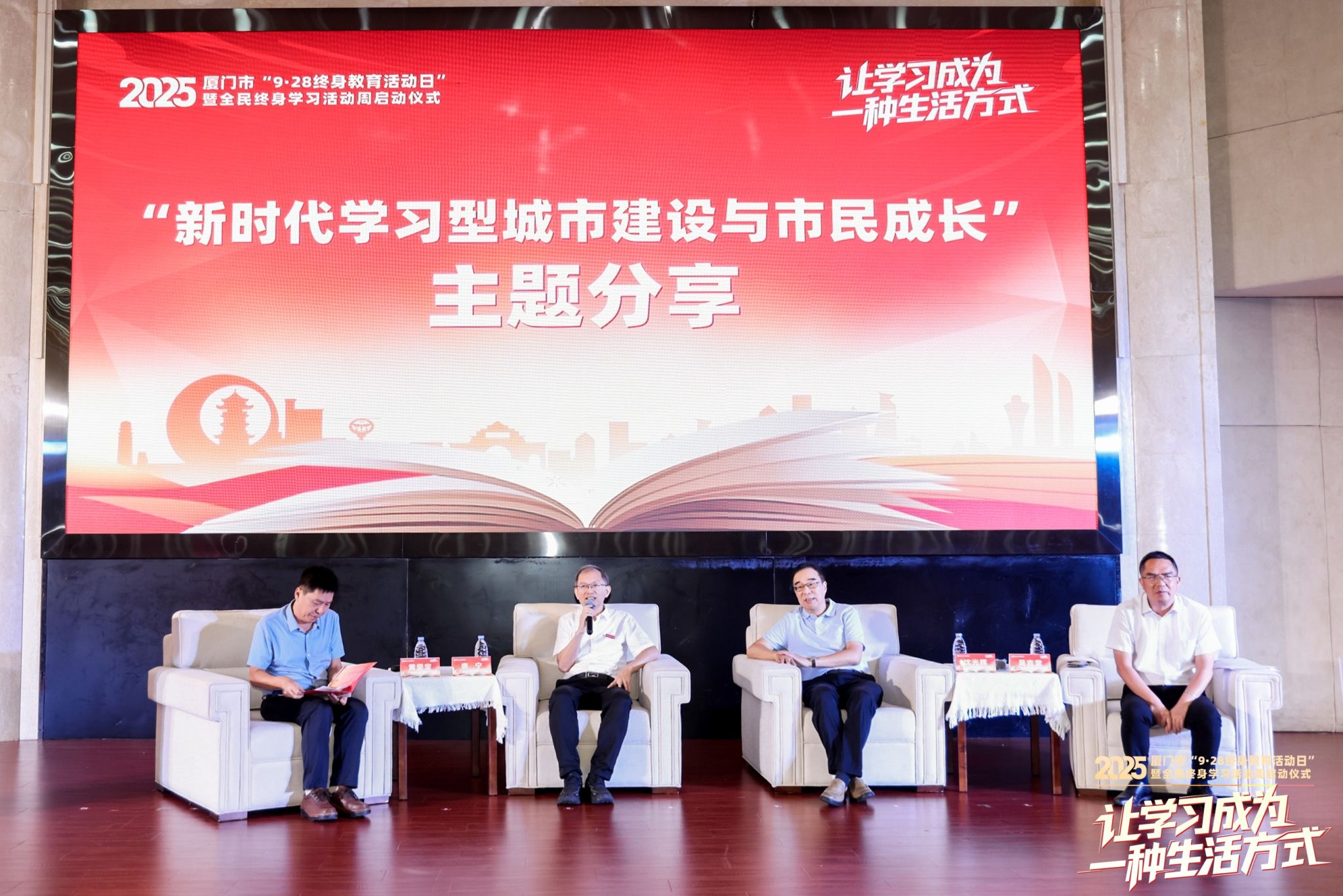 启动仪式后,举行了“新时代学习型城市建设与市民成长”主题分享活动。福建开放大学原副校长沈光辉教授以“学习型城市建设的立足点、落脚点与创新点”为主题,结合全国终身教育发展趋势,深入剖析学习型城市建设的核心逻辑。中共集美区委宣传部部务会成员、集美学村家长学校校长吴吉堂,围绕“嘉庚精神传承与集美区学习型城区建设”作了交流分享。我校校长唐宁以“学习型城市建设的实践逻辑与路径选择”为主题,从高校服务终身教育的视角出发,探析学习型城市建设的时代要求、实践逻辑和实现路径,分享了厦门开放大学在构建全民终身学习服务体系中的探索与成效。