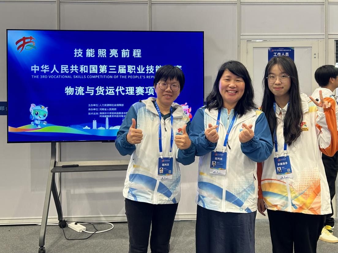 “物流与货运代理”赛项赛事裁判长吕秀文与蓝雅娟、指导教师钟聪儿合影
