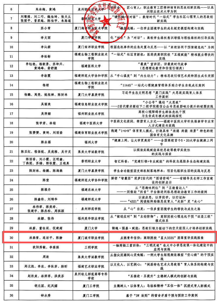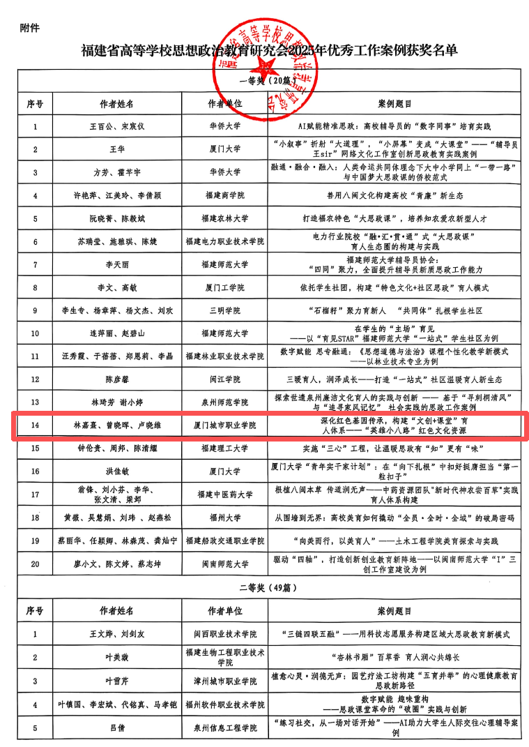日前,福建省高等学校思想政治教育研究会发布了《关于表彰福建省高等学校思想政治教育研究会2025年优秀工作案例的通知》,我校《深化红色基因传承,构建“文创+课堂”育人体系 ——“英雄小八路”红色文化资源育人实践与创新》(作者:林嘉熹、曾晓晖、卢晓维)获一等奖,《点燃青年信仰:高职院校“星火3335”朋辈宣讲实践探索》(作者:林燕菁、连洁平、陈静)获二等奖。