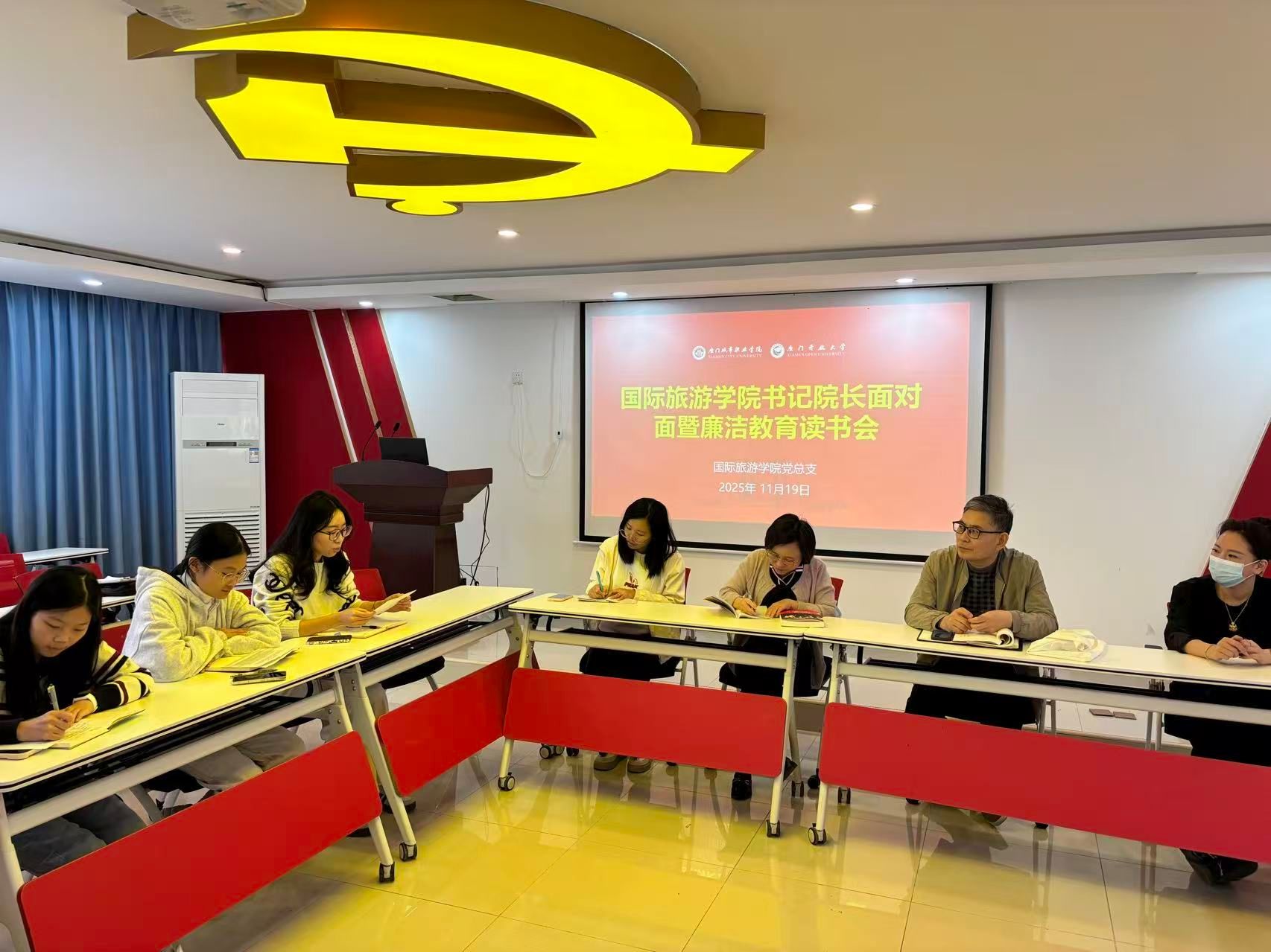 11月19日,国际旅游学院举办“书记院长面对面”暨《习近平与大学生朋友们》读书会。学院党政负责人、辅导员代表与学生预备党员、发展对象围绕“廉洁修身”“党员担当”两大核心主题,结合实习就业、校园生活等展开深入交流。