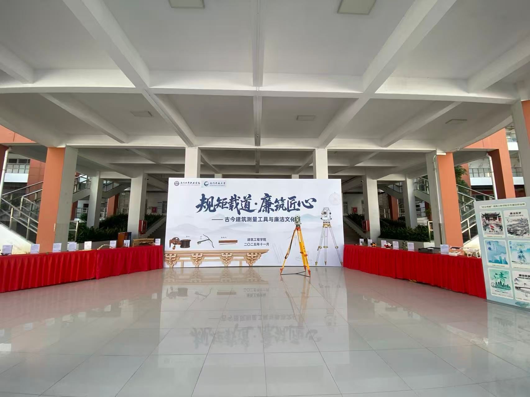 本次展览围绕五大核心板块,推动廉洁理念与专业精神深度融合。“藏于建筑中的千年廉洁密码”板块,通过李端澄督建嘉峪关“廉至一砖”、清廉太守悬鱼拒礼等典故,呈现建筑文化中的廉洁传统;“贪腐之祸”警示展区,通过工程领域坍塌事故等实例,揭露贪腐与违规操作的惨痛后果;“古今测量工具展”陈列青铜卡尺、龙头墨斗、光学水准仪、全站仪、RTK等古今测量工具和设备,展现着从古至今工程测量对精确与规范的追求;“榫卯构建”展区通过木拱桥、鸾峰桥等榫卯作品诠释“结构严谨、坚守底线”的职业准则。“廉洁作品展”则展示了学生们将“廉”的内涵与建筑元素巧妙融合的作品。