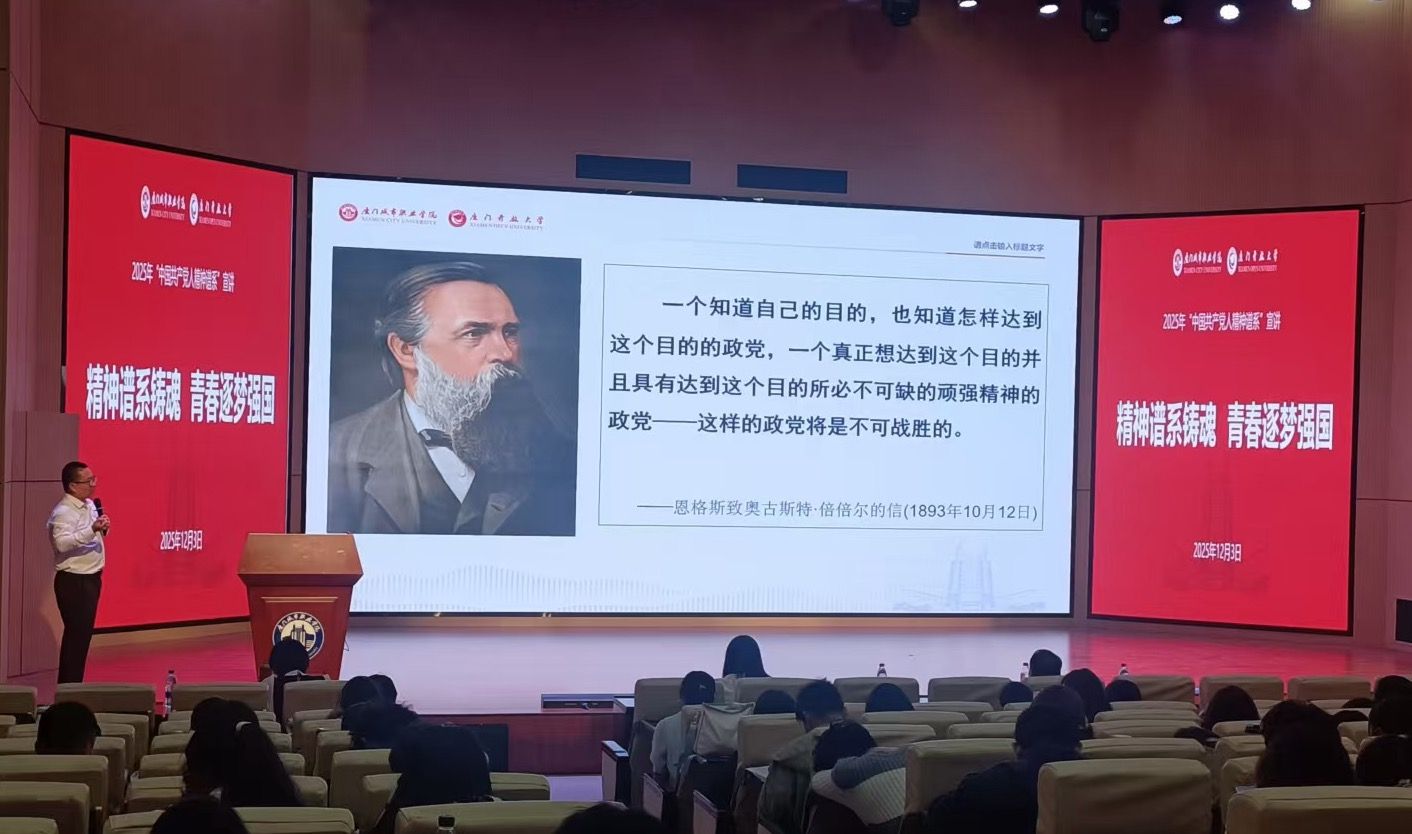 为深入学习贯彻党的二十届四中全会精神,弘扬传承中国共产党的“精神谱系”,12月3日下午,马克思主义学院主办的“中国共产党人精神谱系”宣讲会在南校区笃行楼报告厅举行。第七期青年马克思主义者培养工程大学生骨干培训班学员及学生理论学习社团成员约160人参加宣讲会。