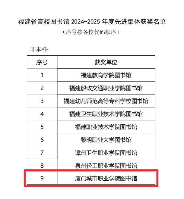 近日,福建省高等学校图书情报工作委员会公布2024-2025年度先进集体评选结果,我校图书馆再度获评“福建省高校图书馆2024-2025年度先进集体”称号,成为我市唯一获此荣誉的高职院校图书馆。