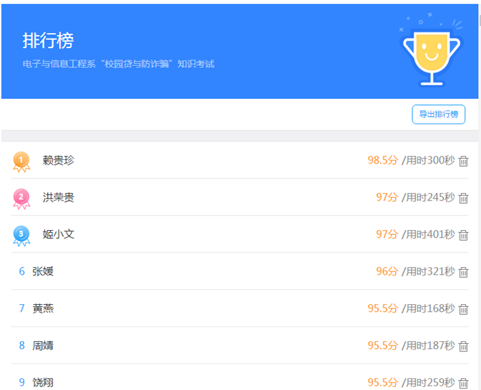3月26日至4月5日,全系同学通过电子与信息工程系学生会微信公众号进行答题测试,截至活动结束,全系共860人参与测试,占学生总数的98.2%。