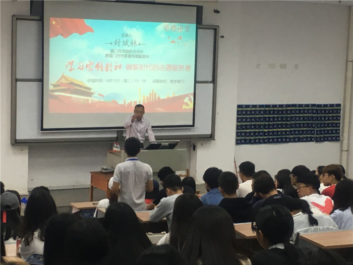 4月11日,商贸系举办“学习雷锋精神,做新时代的志愿服务者”道德讲堂,讲座主讲人为原市委宣传部副部长、现市书院协会会长封斌林。