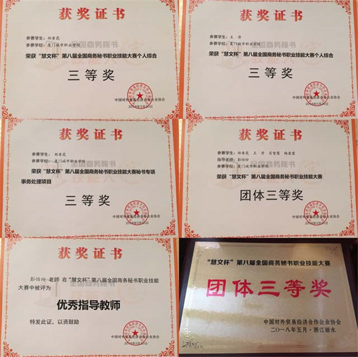 5月19日,“慧文杯”第八届全国商务秘书职业技能大赛在丽水职业技术学院举办。本届大赛共吸引了来自20个省、市、自治区,73所本专科院校的103支队伍参与,参赛选手达412人,是迄今为止历届该项大赛参与人数最多的一次。 我校人艺系文秘专业代表队获得了一个团体三等奖、两个个人综合三等奖、一个秘书专项事务处理三等奖。