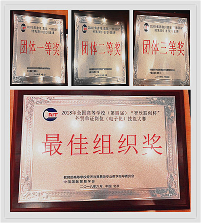 6月1日-3日,在全国高等院校第四届“智欣联创杯”外贸单证岗位(电子化)技能大赛上,我校商贸系和外语系共派出由12名学生组成的三支队伍包揽了团体奖项一、二、三等奖项。