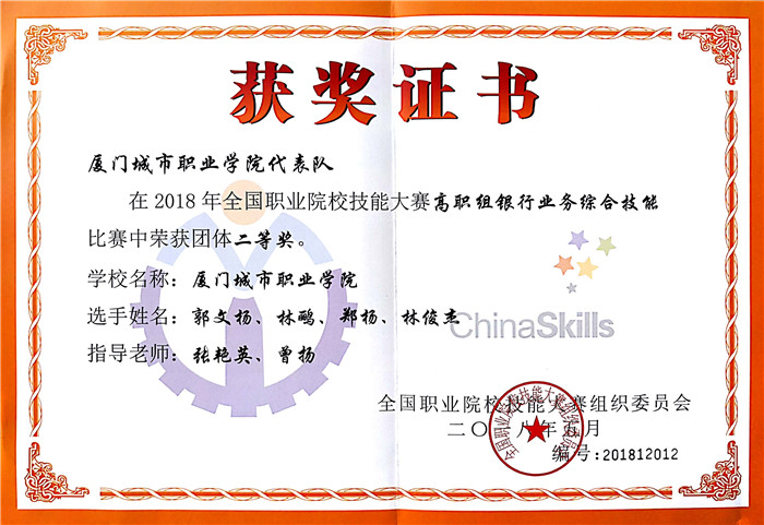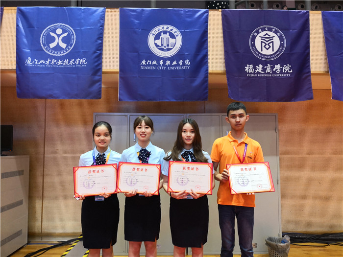 6月2日,2018年全国职业院校技能大赛高职组银行业务综合技能比赛在广州番禺职业技术学院举行。来自全国29个省、市、自治区的78支代表队,共312名选手参加比赛。大赛设银行从业知识、银行基本技能、银行业务能力及展示项目等四项内容。我校金融专业代表队的郭文杨、林鹂、郑杨、林俊杰四名同学在指导教师张艳英、曾扬的指导下,不畏强手,顽强拼搏,最终获得了团体二等奖。