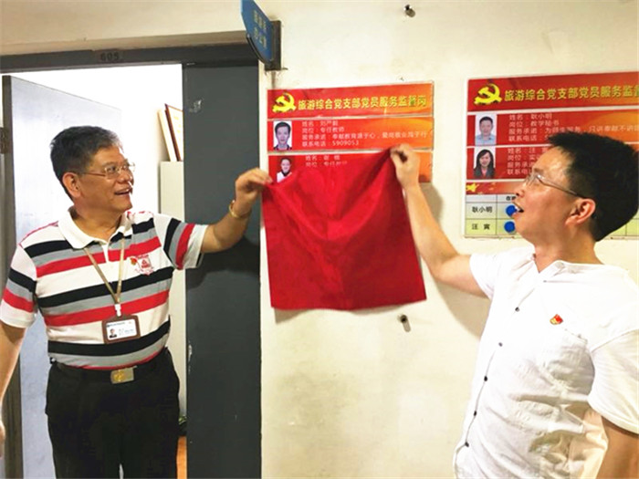 随后,校党委副书记、纪委书记易化和黄邦恩共同为旅游系党总支党员服务监督岗举行了揭牌仪式。