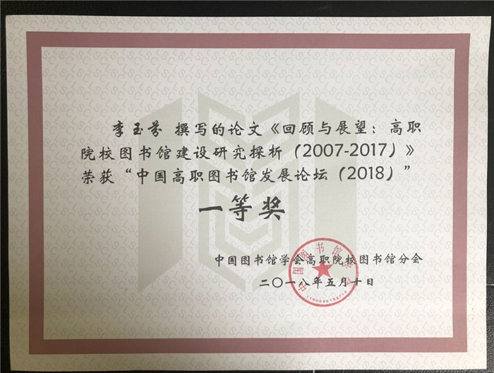 近日,中国高职图书馆发展论坛(2018)在安徽省合肥市隆重举行。本届大会共收到论文244篇,经专家评选,24篇论文获一等奖,我校图书馆李玉芬老师撰写的《回顾与展望:高职院校图书馆建设研究探析(2007-2017)》喜获论文一等奖。