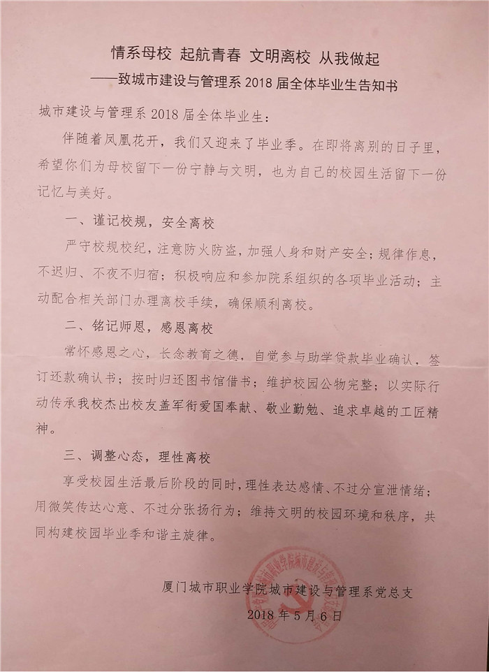 5月起,城建系党总支发出《情系母校 起航青春 文明离校 从我做起——致城市建设与管理系2018届全体毕业生告知书》,通过微信公众号、系部网站、班级QQ群等多渠道进行倡议,由毕业班辅导员、系学生会干部利用走访寝室的时间向毕业生们宣传倡导文明离校,受到了毕业生们的肯定与支持,取得良好成效。