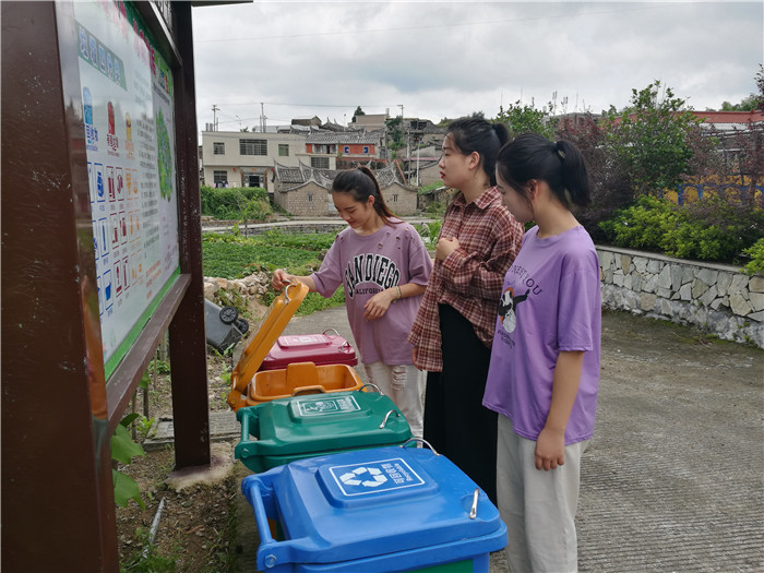 淡淡茶香飘散,街道干净整洁,一尘不染。在村庄道路显眼的位置摆放着四色垃圾桶,村部的宣传栏上写着垃圾分类的方法以及注意事项,沿路的灯杆上挂着“垃圾分类共同参与”的彩旗……