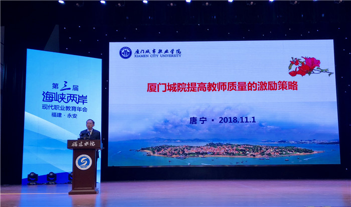 10月31日,由福建省教育厅主办的第三届海峡两岸现代职业教育年会隆重开幕。来自海峡两岸120多所应用技术类大学、高职院校和中职学校的院校长等450多位专家学者齐聚一堂,共同探讨职业教育发展。校长唐宁应邀参会并作专题报告。