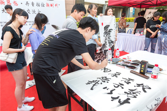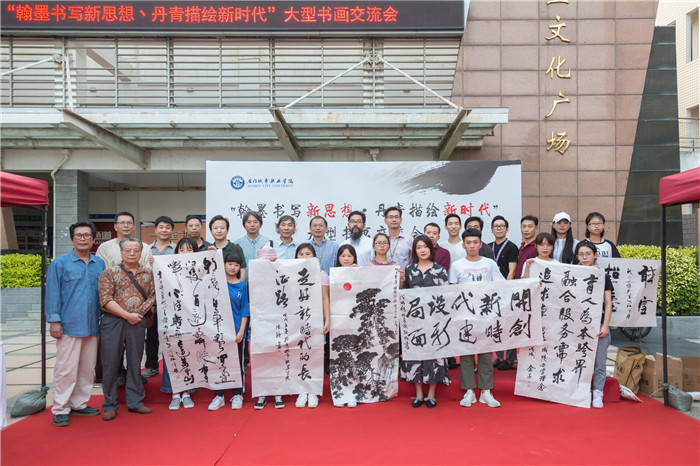 为弘扬中华优秀传统文化,进一步兴起“大学习”热潮,我校于11月7日下午,在学生文化广场举办题为“翰墨书写新思想·丹青描绘新时代”的大型书画交流会。厦门书协副主席、中国书法家协会会员朱金镑等11位书画名家受邀来校,校长唐宁,校党委副书记王育培和校团委、财金系党总支相关负责人及大学生书画协会近百名学生代表参加活动。