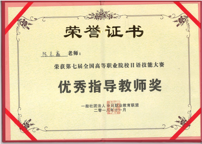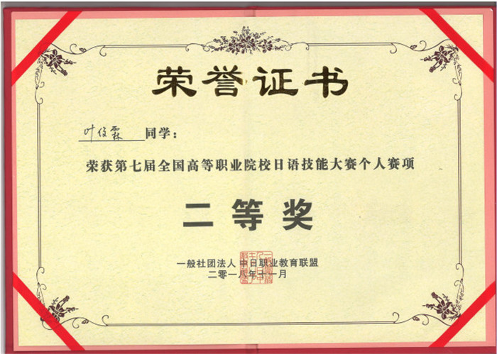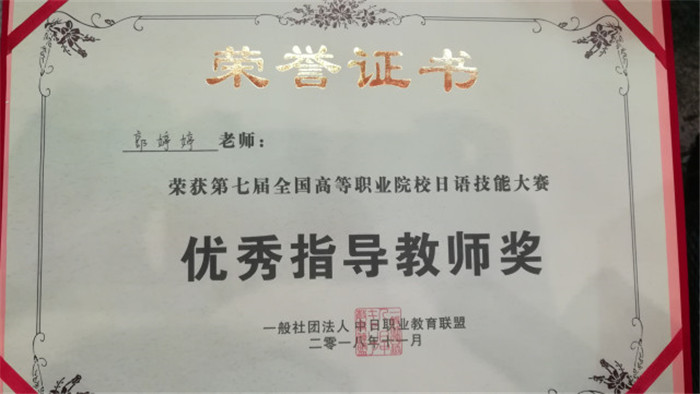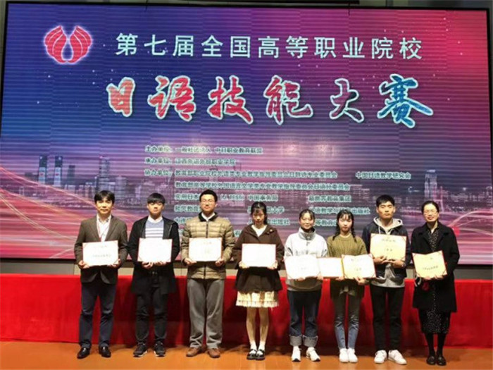 近日,在第七届全国高等职业院校日语技能大赛中,我校商务日语专业李陈英、林憶星、吴书杨、成淇、杨淙杰等同学组成的代表队获得了团体二等奖,叶俊霖同学获得个人二等奖,陈志鑫和郭婷婷老师获优秀指导教师奖。