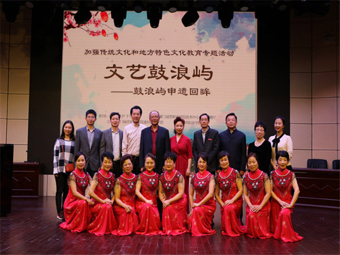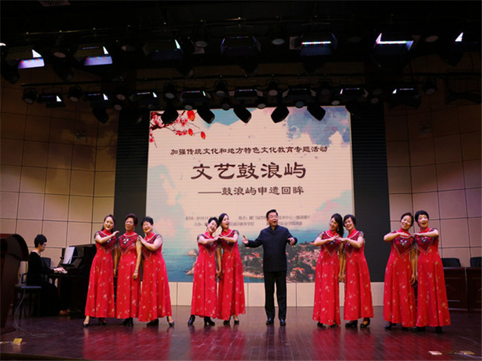 吴松青在致辞中阐明了加强传统文化和地方特色文化教育的重要意义和举措。鼓浪屿宣讲团团长董启农介绍了申遗全过程和鼓浪屿背后鲜为人知的故事。随后,中国曲艺家协会会员陆以诺、何洁表演了配乐诗朗诵《今夜我又回到鼓浪屿》,鼓浪屿女声合唱团深情演唱了《海上花园》和《鼓浪屿》两首歌曲。