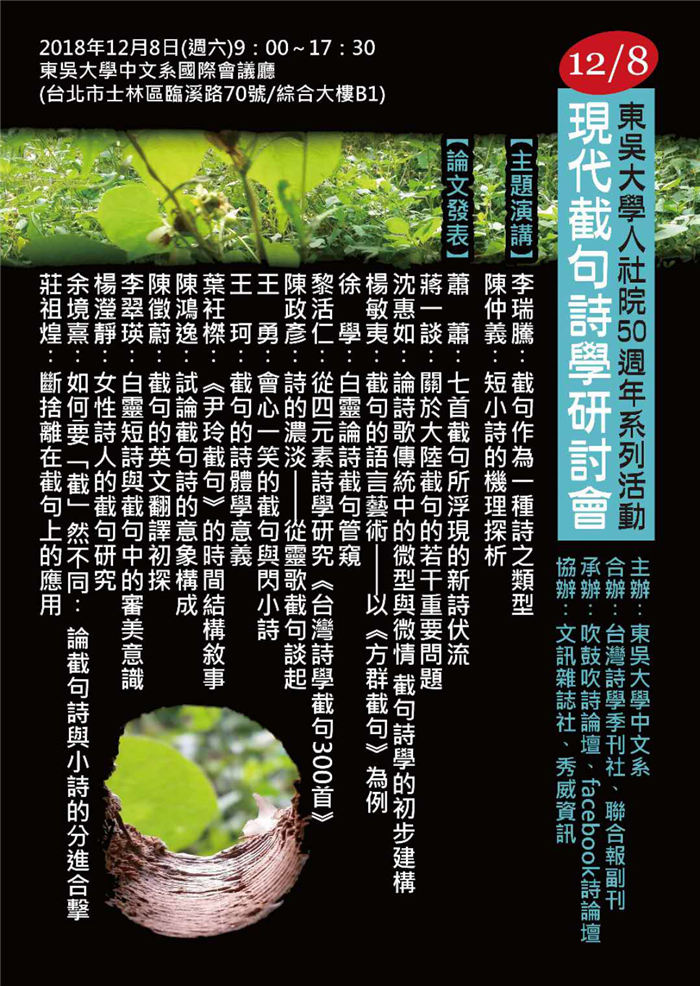 另悉,12月8日,陈仲义教授在台湾东吴大学主办的“现代截句诗学”研讨会上应邀做主题演讲。活动共有大陆四位学者与会。