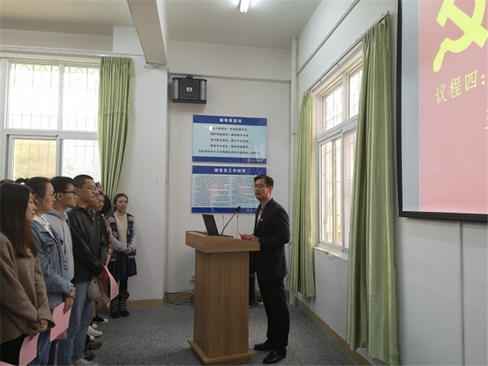 1月11日上午,学生工作处组织2018年度学生党员入党宣誓仪式。校党委副书记王育培、学生工作处处长陈小明、各院系学生党支部书记和48名新加入中国共产党的学生党员参加了宣誓仪式。
