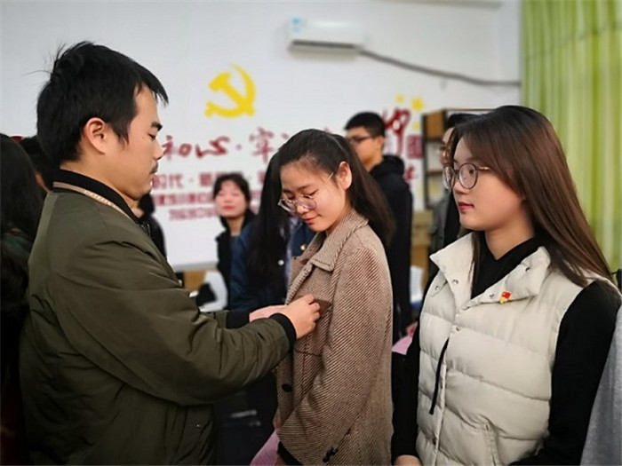 学生党支部书记为新党员佩戴党徽
