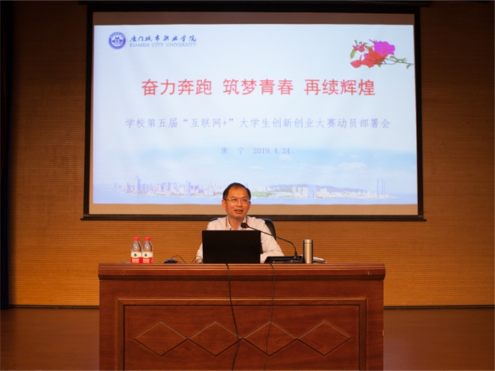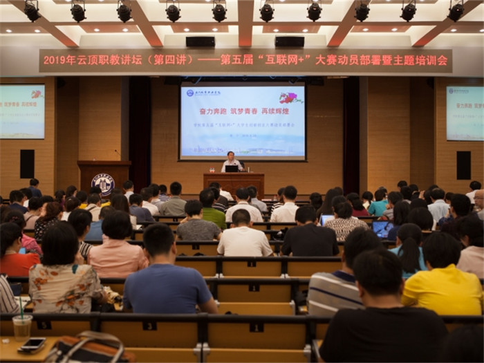4月24日下午,我校以第五届“互联网+”大赛动员部署暨主题培训作为2019年云顶职教讲坛第四讲的内容。学校党委书记蒋先立、校长唐宁、副校长吴松青,各院系、学生处、人事处、团委等部门负责人以及全体专任教师参加了大 会。吴松青主持了大会。