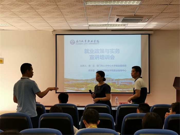 为进一步落实福建省教育厅《关于进一步加强和改进高校毕业生就业统计工作的通知》和厦门市人力资源和社会保障局、 厦门市公安局关于印发《重点群体来厦落户实施细则的通知》等文件精神,有针对性的做好2019届毕业生就业工作,我校于4月24日下午举办了就业政策与实务宣讲培训会。本次培训邀请了厦门市人才中心大学生就业服务部副部长陈云、窗口业务骨干谢美清做为宣讲嘉宾,各院系毕业班辅导员和学生参加了会议。