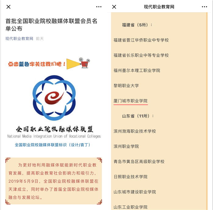 我校融媒体中心坚持将大学生思想引领作为首要任务,承担学校网络育人工作,学校团委微信公众号长期居于福建省高校前列。我校融媒体中心下设的“厦小城工作室”最近又以优秀的表现和工作实绩入选2019年福建省“学校团干名师工作室”建设试点名单,全省仅8个。2018年,我校成为中国(福建)高校校媒联盟的会员单位,积极参加、配合校媒开展各项活动,圆满完成了工作要求,充分展示了我校良好的形象和品牌影响力,这次加入全国职业院校融媒体首批成员单位,必将在更加广阔的平台上进一步讲好学校故事,提升学校影响力。
