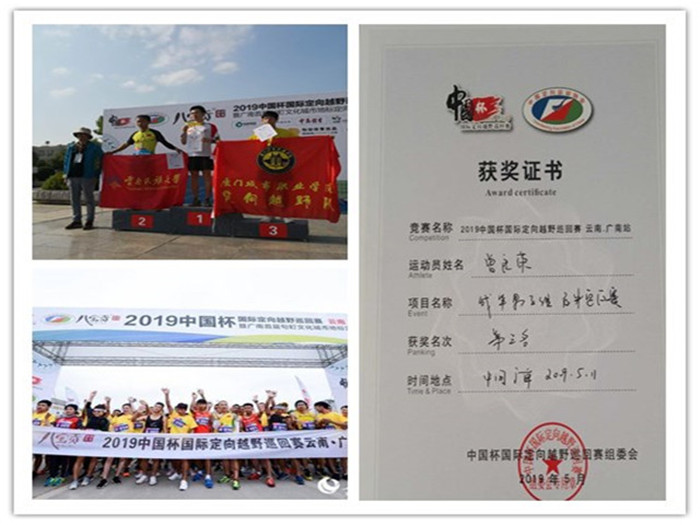 5月11日-5月12日中国杯定向越野巡回赛在云南省文山州广南县举行。本次比赛吸引了来自国内外3000余名参赛选手,我校定向越野队由体育教研部庄志彬老师指导并带队参加本次比赛,经过两天的激烈角逐,我校曾良荣同学充分发挥自身实力,突破重围,勇夺专业组百米定向赛第三名的佳绩。