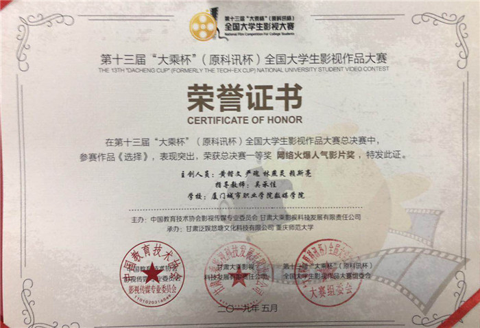 近日,第十三届“大乘杯”全国大学生影视作品大赛评选结果揭晓,我校数媒专业学生黄锴文、严瑰、林燕灵、赖思亮的作品《选择》获总决赛一等奖“火爆人气影片奖”。