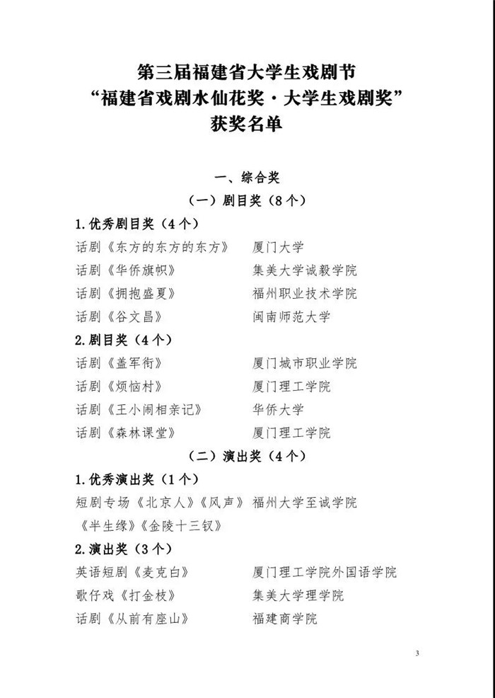 日前,由福建省文联、省教育厅、省戏剧家协会联合主办的第三届福建省大学生戏剧节评奖结果出炉,我校选送的参赛话剧《盖军衔》荣获“福建省戏剧水仙花奖·大学生戏剧奖”剧目奖,旅游系郭玉玺同学获表演奖(非专业组)二等奖,电子系陈俊霖同学获表演奖(非专业组)三等奖。