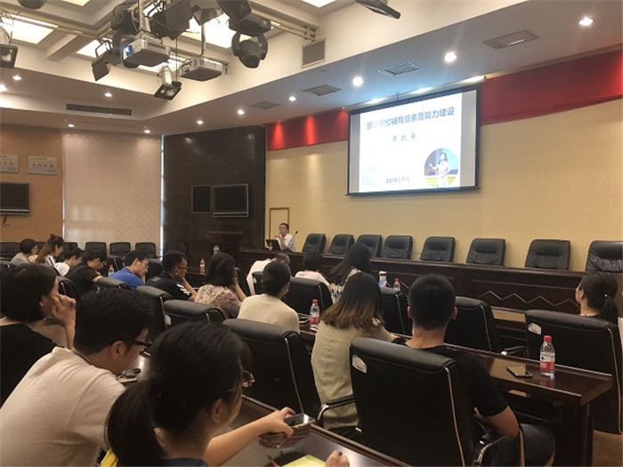 黄跃舟教授以第七届全国高校辅导员素质能力大赛一等奖获得者—中南大学辅导员王远征的先进事迹为引题,围绕辅导员要高学历更要高素质强能力、顶层设计下的辅导员素质能力提升途径、关于素质能力大赛之“理论宣讲”、关于素质能力大赛之“谈心谈话”和辅导员素质能力自我提升的几点建议等五大方面做了全面深刻的讲解。最后,他满怀深情寄语在场所有辅导员们:“要把谋生的职业变成圆梦的事业,把有意义的事做成有意思的事,要把人生快乐寄托在学生成长上!”
