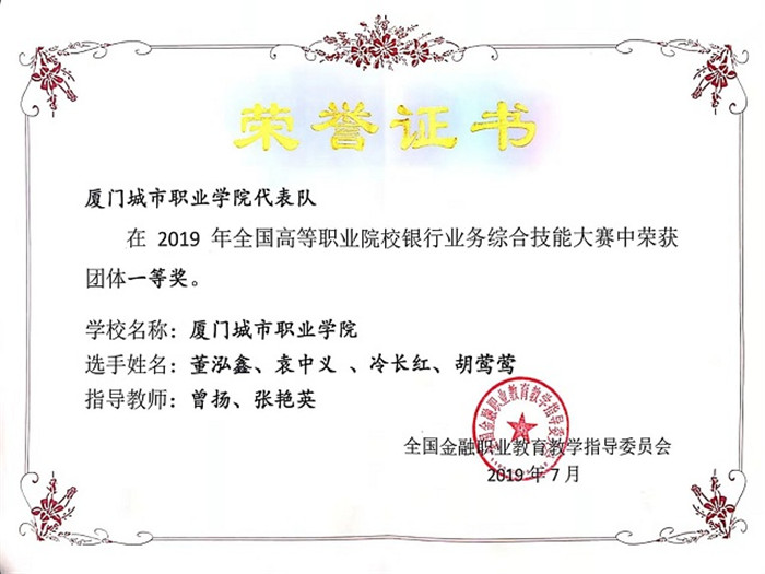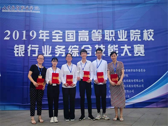 近日,在山东外贸职业学院举行的2019年全国高等职业院校银行业务综合技能大赛上,我校金融管理专业16级、17级的四名学生袁中义、董泓鑫、冷长红、胡莺莺在曾扬、张艳英老师的指导下,荣获团体一等奖,取得了我校参加该赛事以来的最好成绩。