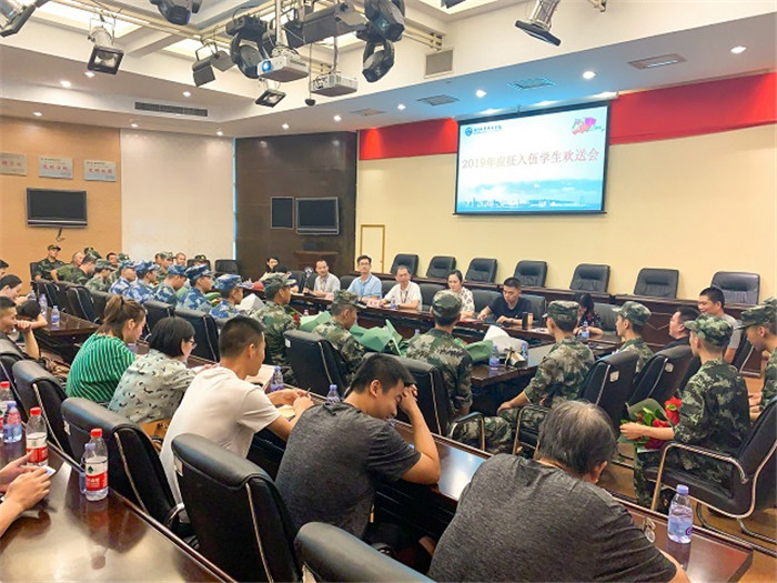 9月9日下午,我校举行2019年应征入伍学生欢送会。校长唐宁、党委副书记王育培,学工、后勤、保卫等部门领导,相关总支负责人、辅导员,应征入伍学生士兵、家长代表和退役复学学生代表参加会议。