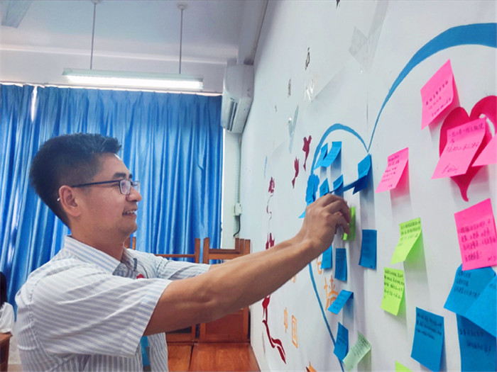 辅导员吴水芳以习近平总书记在纪念长征胜利80周年大会上的原话即“心中有信仰、脚下有力量”为开篇导入语,点出伟大的长征精神。现场四位同学生动讲述了英雄人物邱少云、谷文昌、王继才、黄大年的红色故事,有力地传递了时代先锋的榜样力量。活动中同学们还进行了深刻剖析,反思享乐主义、拜金主义、社会责任感淡漠、人际交往功利化、读书无用论等信仰偏差,并对如何重构信仰进行了分享交流。“我爱你,中国”的签名墙活动燃爆了现场,满墙的祝福语寄托了大家满满的家国情怀。最后王育培呼应吴水芳的演讲题目,以《心中常“三问”,脚下多行动》为题和同学们进行了精彩的分享交流。王育培以习近平总书记在南开大学考察时特别提到张伯苓老校长的“爱国三问”为题,回顾历史,联系实际,从认知、情感、行为三个层面阐释了“爱国三问”的时代价值和现实意义,引导同学们既要用心去思考,更要珍惜韶华、坚定信仰,把爱国情、报国志转化为明德、求知、强技、笃行的强大动力,用毕生的努力去回答好“爱国三问”这一“历史之问、时代之问、未来之问”。