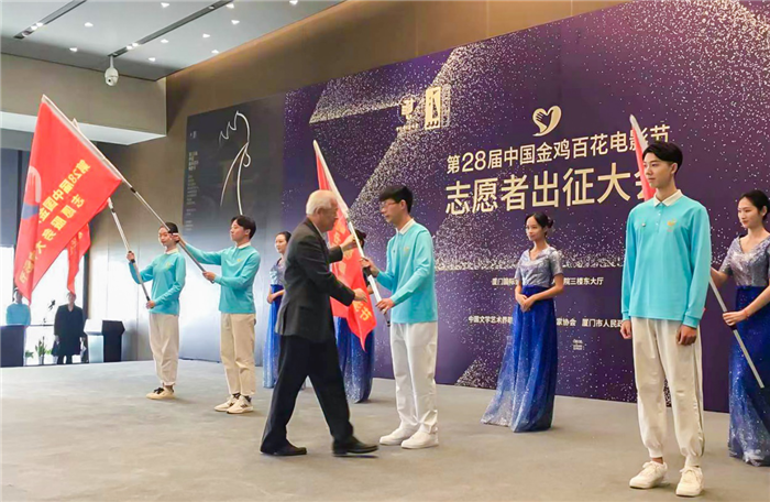 11月16日上午,第28届中国金鸡百花电影节志愿者出征大会在厦门国际会展中心海峡大剧院举行。近600名即将服务本届盛会的志愿者庄严宣誓,决心要以自己热情和服务,为本届盛会增光添彩。