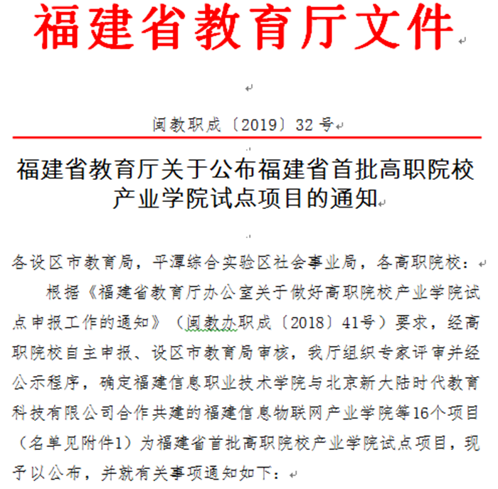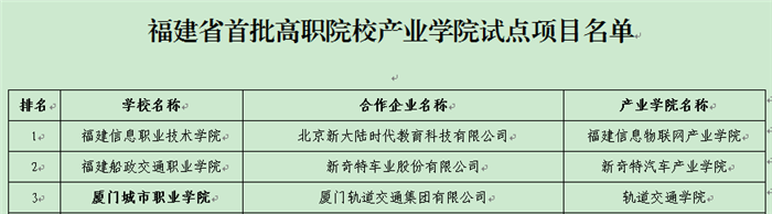 近日,福建省教育厅公布“福建省首批高职院校产业学院试点项目”名单。我校轨道交通学院成功入选该试点项目。此次评选经院校自主申报、市教育局审核,省教育厅组织专家评审并经公示立项。产业学院的立项,将有利于深化校企合作,推动高职院校办学机制创新,实现校企资源共享、互利共赢,促进新技术、新标准、新规范及时融入教学,提升专业内涵和人才培养质量。