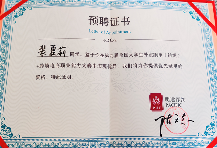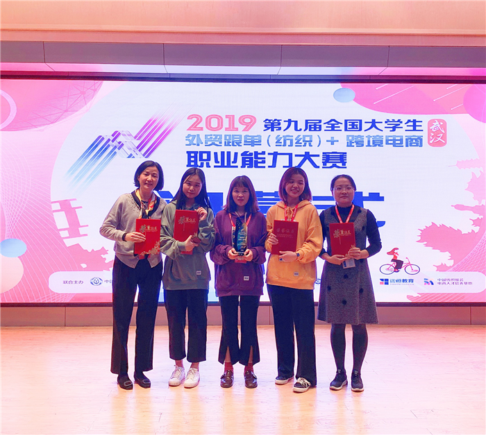 近日,由中国纺织服装教育学会、教育部高等学校纺织服装教学指导委员会和全国纺织服装职业教育教学指导委员会联合主办的第九届全国大学生“远恒杯”外贸跟单(纺织)+跨境电商技能大赛在湖北省武汉纺织大学举办,共有来自全国34所高校,49支参赛队伍的147位选手展开角逐。我院商贸系国际贸易实务专业由韩燕老师和许玲老师带队,由17国贸B班裴夏莉、陈倩和黄彩英同学组成的参赛代表队夺得了全国高职组一等奖,个人一等奖获得者裴夏莉同学因此也获得了大赛赞助企业的预聘书。