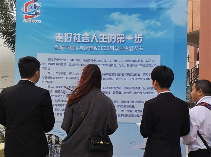 看点四:严管与厚爱并重,上好社会人生第一课。城建系毕业生就业岗位多在工程项目一线,城建系以“走好社会人生的第一步”为主题,在招聘会现场设置廉政教育展板,以“毕业生职场廉洁诚信倡议书”和“工程项目案例警示教育”为主要内容,引导毕业生知敬畏、存戒惧、守底线。