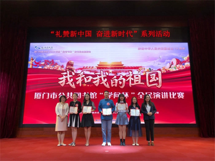 11月23日上午,由厦门市社会科学界联合会指导、厦门市图书馆学会和厦门市图书馆主办的“我和我的祖国”厦门市公共图书馆 “学问杯”全民演讲比赛落下帷幕。我校五位选手取得佳绩,18级金管专业王秀岚获得亚军,19级物流专业钱晓曼(健心读书会会长)、19级早教专业郑宇、18级学前专业徐佳依、18空乘专业王源源等获得季军。