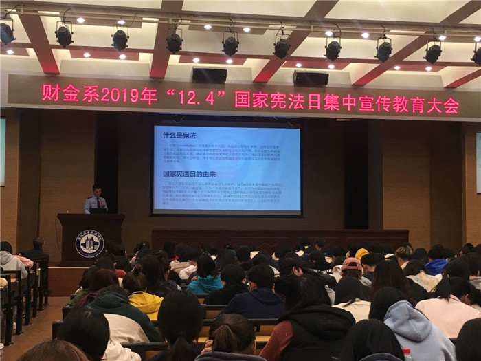 12月3日,财金系党总支在会议中心召开2019年“12.4”国家宪法日集中宣传教育大会,邀请了厦门市反诈骗中心洪恒亮警官为同学们作法制教育宣传。