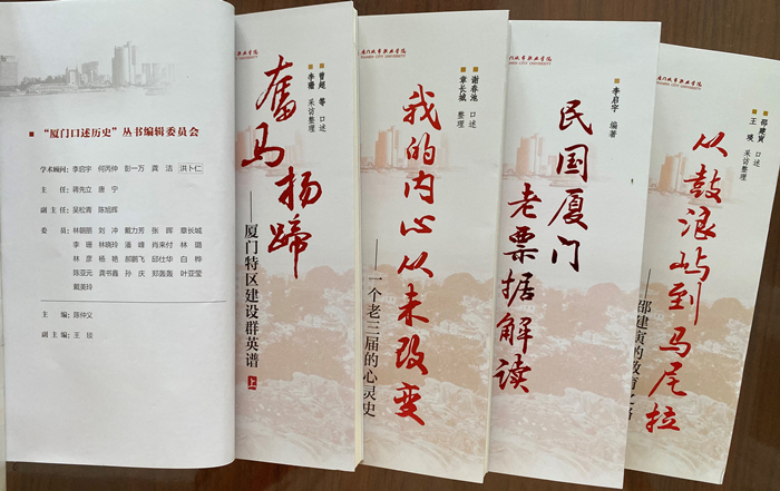 在学校党委、办公室、财务处、科研处大力支持下,我校编辑出版厦门口述历史丛书。编辑委员会主任由蒋先立、唐宁担任,副主任吴松青、陈旭辉,主编陈仲义。本校李珊、章长城、潘峰、林晓玲老师参与了第一、二辑的采写、整理、编辑工作;其他老师:林彦、肖来付、林璐、杨艳、邱仕华等也在各自的分册中展开作业。