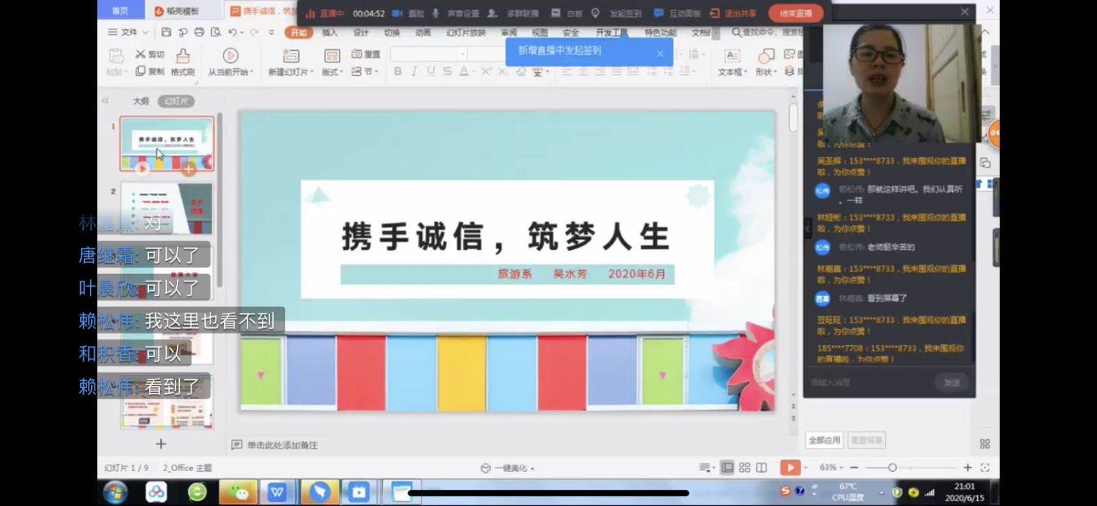 针对助学贷款毕业生,旅游系辅导员吴水芳6月15日运用钉钉直播平台,开展了“携手诚信、筑梦人生”的专题讲座, 向2020届毕业生宣讲诚信还款的重要性及违约带来的不良后果,深入讲解征信知识,解读征信系统个人信用记录与个人生活的重要关系,教育毕业生守护好自己的信用,提醒同学们要避免出现不良记录。党总支副书记林嘉熹告诫他们要珍爱个人信用记录,做诚信表率、树良好形象,同时勉励他们要努力工作、自立自强,充分发挥专业特长,感恩学校,感恩社会,感恩祖国。