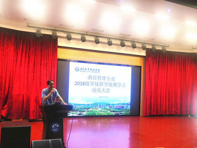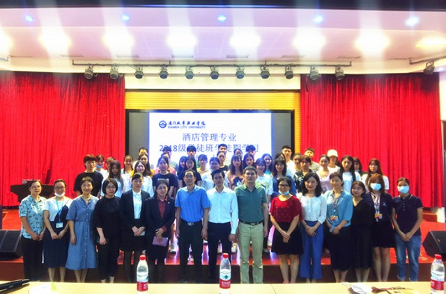 8月31日上午,旅游系2018级酒店管理专业现代学徒制班在学校4区101召开学徒期动员大会。参与该学徒制试点项目的四家酒店代表:厦门悦华酒店人力资源总监代霞、厦门特房波特曼酒店人才培训专员经理黄艺芬、厦门五缘湾酒店人力资源部陈维希、厦门帝元维多利亚酒店人力资源总监蔡晓玫及培训经理叶福远一行莅临参加,学校副校长吴松青、旅游系主任吴小健、酒店管理专业主任王宏兰、酒店管理教研室全体教师及班级辅导员,酒店管理专业现代学徒班36名学生出席会议。会议由吴小健主持。