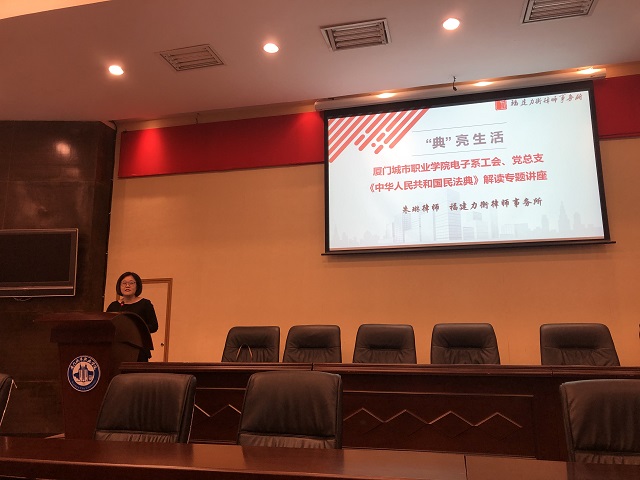 本次讲座邀请了福建力衡律师事务所朱琳律师,以“典”亮生活为题,对民法典进行了全方位的解读。朱琳律师从民法典的立法背景、意义、亮点入手,对民法典的体系和基本框架、民法典做出的重大调整、民法典对个人生活的影响进行着重讲解,结合典型案例,对合同、物权、侵权责任、婚姻家庭、继承等与广大群众日常生活息息相关的法条进行了深度解读分析。