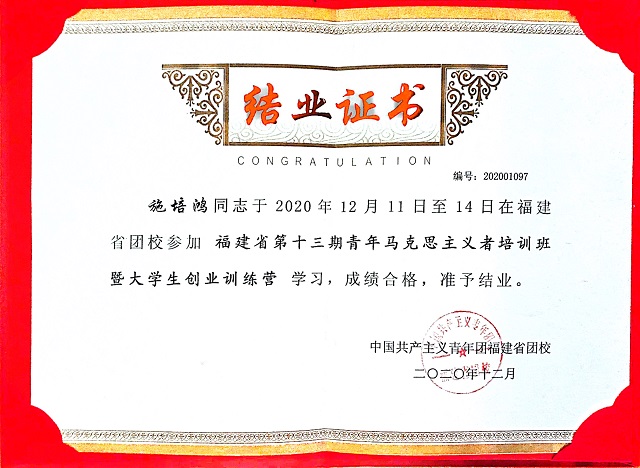 12月11日至14日,福建团省委联合省学联在福州举办福建省第十三期青年马克思主义者培训班暨大学生创业训练营,来自全省各高校的百余名学生参加了本期培训班。我校选送校团委青年成长中心自律部保卫部副部长施培鸿同学参加此次培训,并顺利结业。