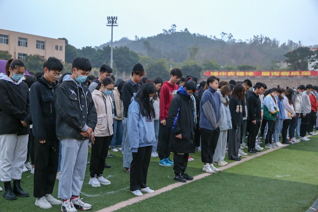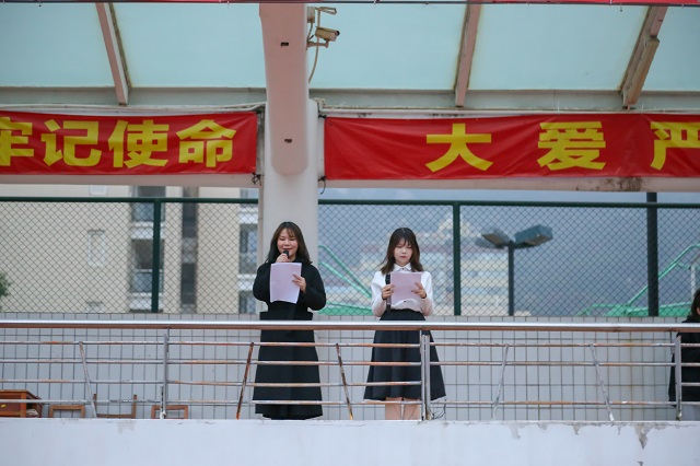为纪念第七个南京大屠杀死难者国家公祭日,激发学生“牢记历史·振兴中华”的爱国情怀,12月14日“国旗下讲话”活动的第一环节是纪念国家公祭日主题教育活动。活动中,来自校青年宣传中心播音部的夏心怡同学和王珺同学,现场朗诵诗歌《缅怀先烈遗志,勿忘南京国耻》,号召同学们勿忘国耻,珍爱和平,不断增强社会责任感和历史使命感,自觉肩负起时代所赋予的使命与责任,在实现民族复兴的新征程中放飞青春梦想。随后,全体师生庄重肃穆,为在南京大屠杀中不幸遇难的同胞和为祖国牺牲的革命英烈集体默哀。
