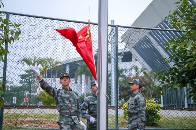 12月14日早上,3000余名学生在北校区田径场整队肃立,举行隆重而庄严的升国旗仪式。由国旗班成员组成的护旗方队踏着整齐坚定的步伐走向升旗台,在激昂雄壮的国歌声中,五星红旗冉冉升起,在场师生向国旗行注目礼唱国歌,深怀对祖国的无限热爱和崇高敬意。