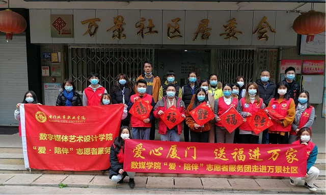 为进一步加强大学生社会主义核心价值观培养和投身文明实践意识,1月11日数字媒体艺术设计学院“爱·陪伴”志愿者服务团联合思明区妇联组织师生代表走进万景社区开展“爱心厦门 送福进万家”主题志愿活动。