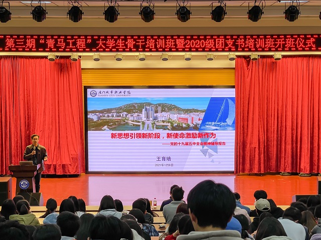 开班仪式后,王育培为全体学员进行了题为《新思想引领新阶段,新使命激励新作为》党的十九届五中全会精神辅导报告。王育培从我国“十三五”成就说起,以我校学生在“十四五”期间个人的五年规划为导入点,结合学习党的十九届五中全会精神,从新思想、新理念和新使命三个部分,分享了新时代青年如何把握新阶段,以新发展理念为指引,构建新格局、激励新作为,成长为社会主义合格建设者和可靠接班人。
