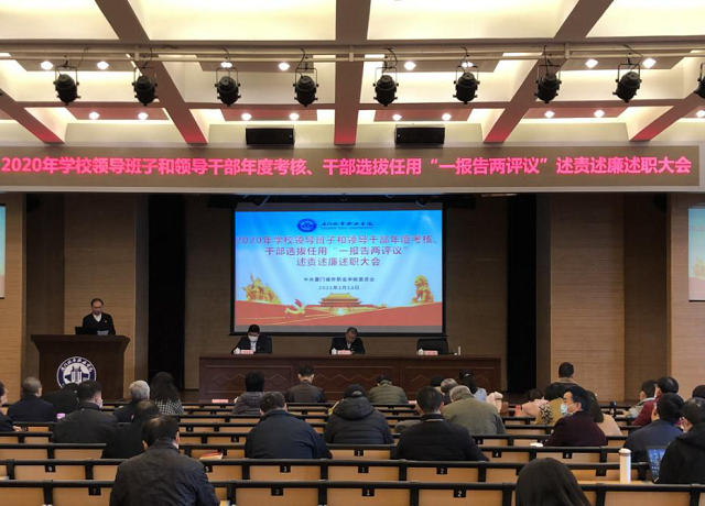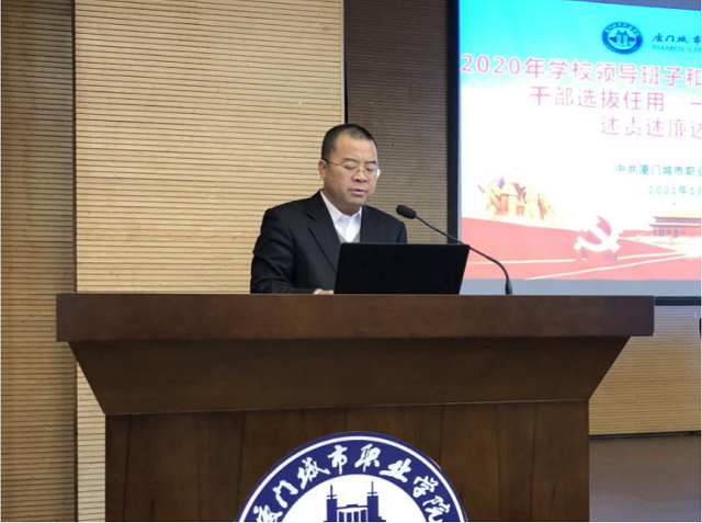 会上,党委书记蒋先立代表学校领导班子作《厦门城市职业学院2020年度工作报告》和《中共厦门城市职业学院委员会关于2020年干部选拔任用工作的报告》两个专题报告。领导班子成员按照工作部署和要求,从德、能、勤、绩、廉方面作述责述廉述职书面报告;副处级干部作述责述廉书面报告。
